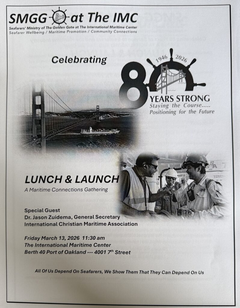 The Lunch and Launch event therefore marked not only a celebration of eighty years of maritime ministry in the Bay Area but also the beginning of a renewed effort to integrate that ministry more deeply into the life of the region. Anchored firmly in ship visiting and pastoral presence, SMGG at the IMC is also positioning itself as a bridge between seafarers, the maritime industry, and the community that surrounds the Port of Oakland. By strengthening these connections, the ministry hopes to ensure that care for seafarers continues to flourish while also serving the wider maritime community for many years to come.